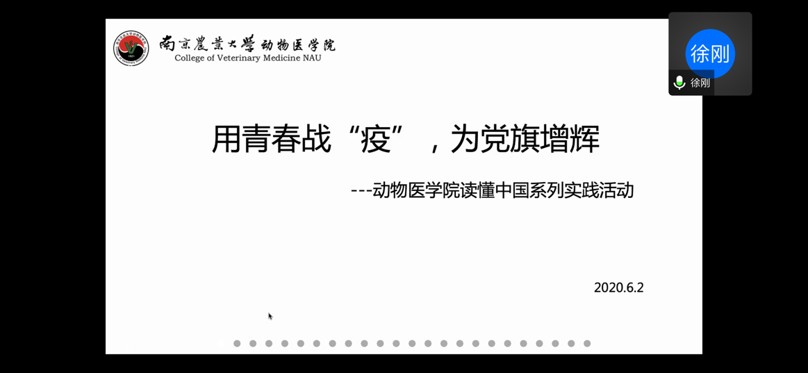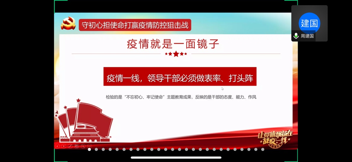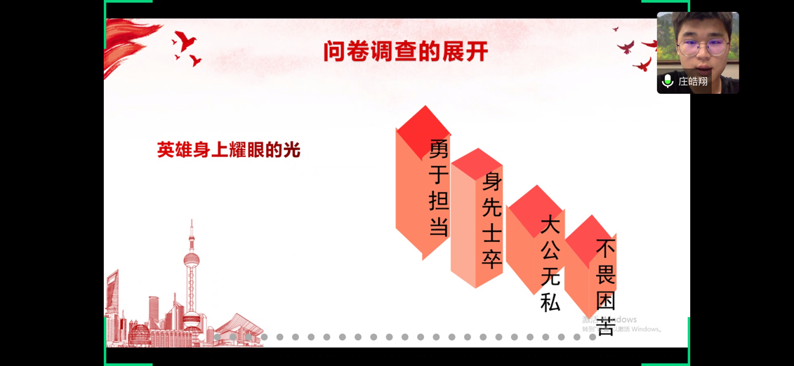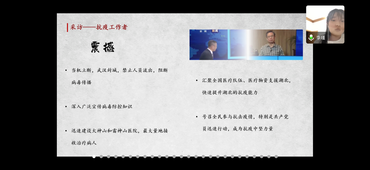 6月2日晚上18:00时许,我院“用青春战‘疫’,为党旗增辉”读懂中国系列活动在线上进行最后的展示。本活动以“抗击疫情”为主题,分成影片观赏和调查采访两个部分。初级党建班同学被分为12组,通过前期观看影片记录感受、分发调查问卷、线上线下采访,最终进行线上分享会,为全体师生上了一堂别出心裁的党课。