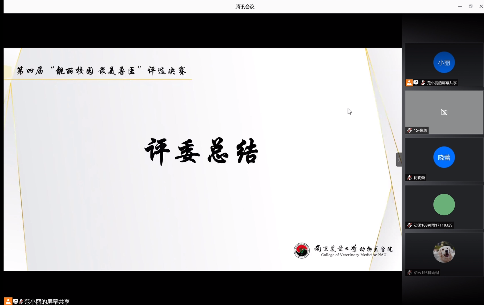 比赛阶段由参赛选手们的自我展示和与问答环节组成。在投票阶段中,评委们以群投票的方式进行表决。最后,姚敏磊老师对本次活动进行了总结,对选手们给予充分肯定的同时也对动医的同学们表达了殷切的期望。
