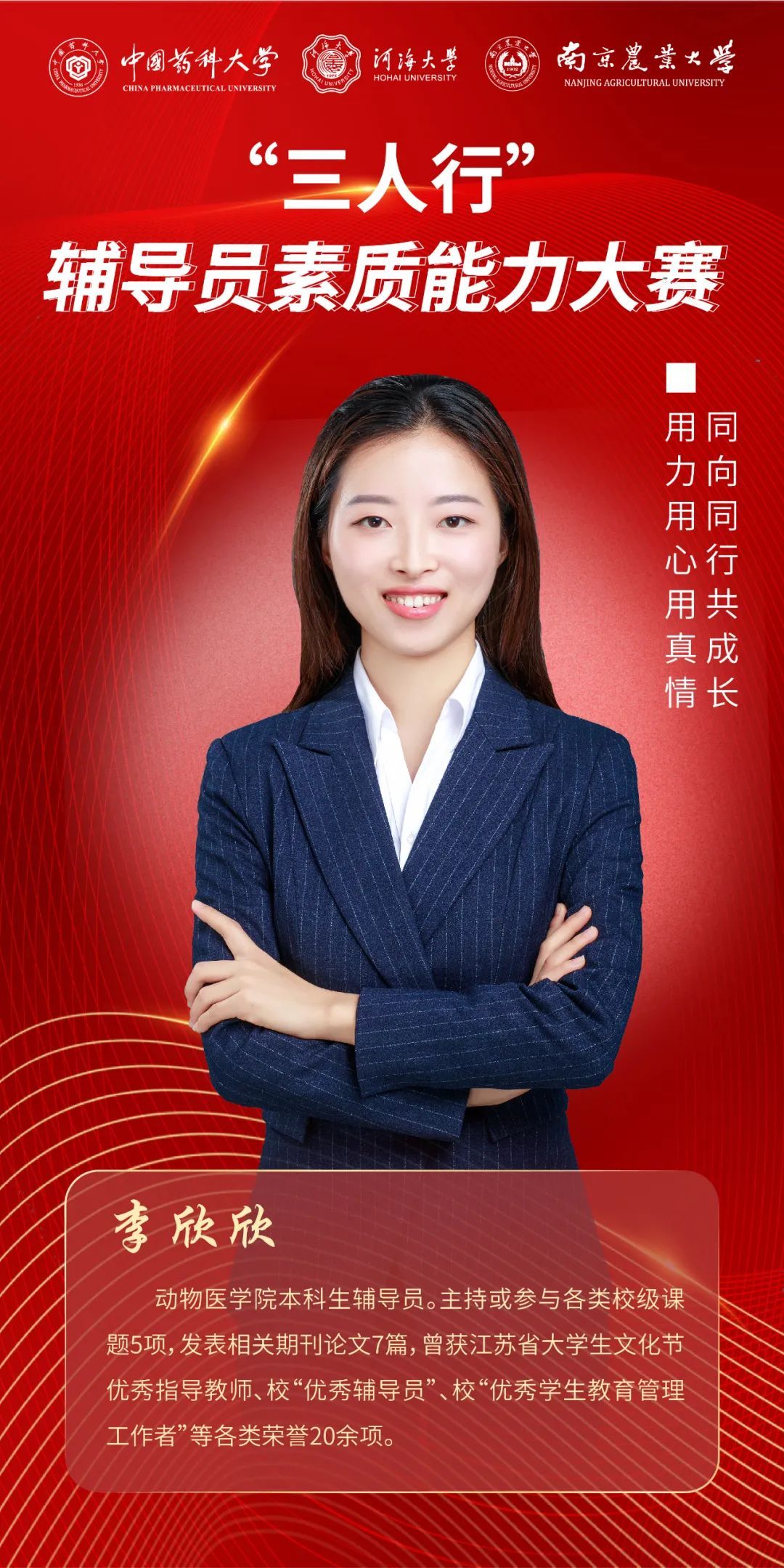 12月7日,由中国药科大学、河海大学、bwin必赢3003共同主办的“三人行”辅导员素质能力大赛如期举行。来自3所高校的12名辅导员经过各自校赛的激烈角逐,脱颖而出进入此次三校联赛。决赛主要包括案例分析和谈心谈话两个环节。经过两个环节的激烈角逐,我院辅导员李欣欣喜获特等奖,辅导员金洁南喜获一等奖!