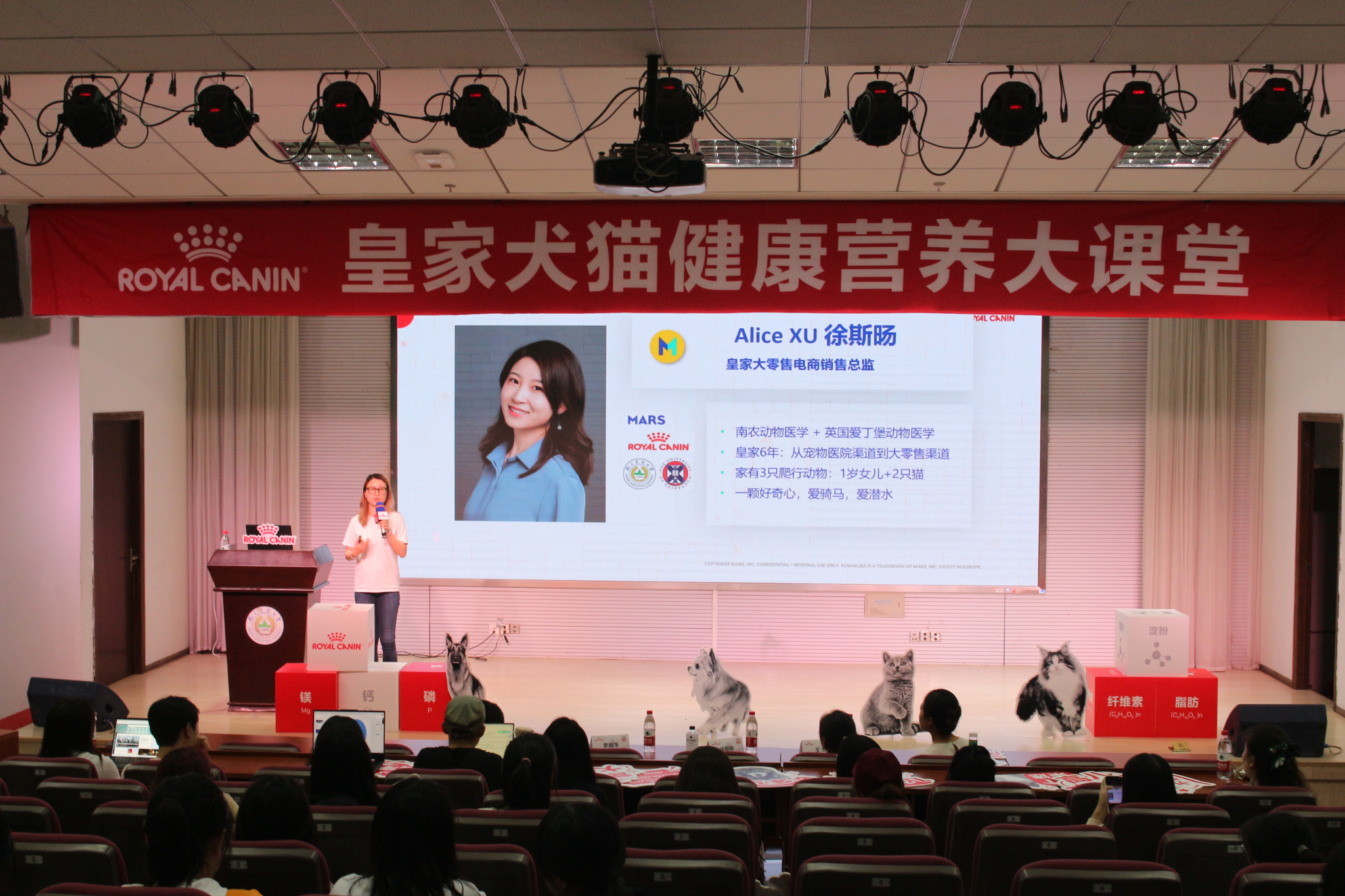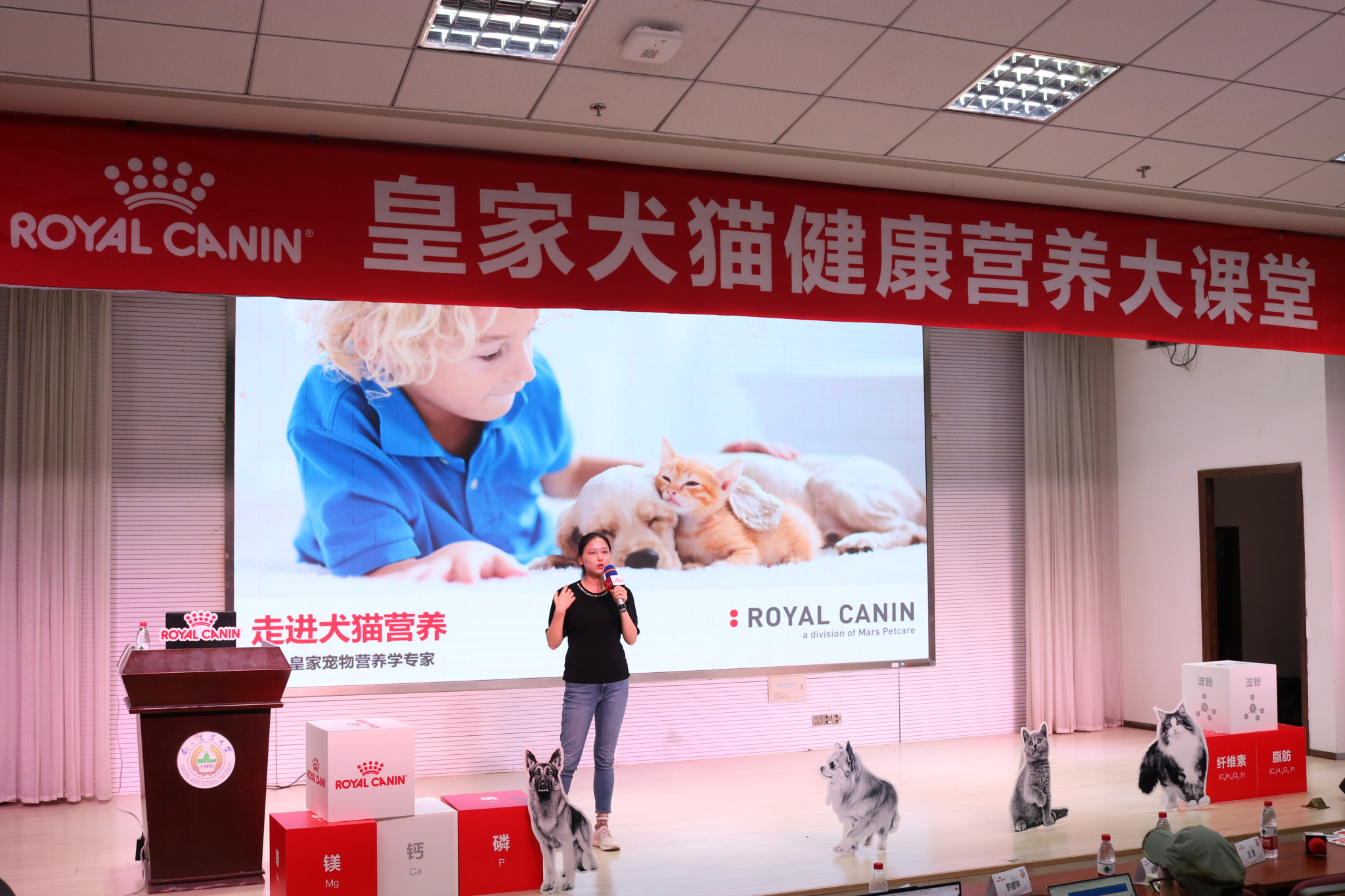 随着皇家宠物食品宣传视频的告一段落,此次皇家犬猫营养大课堂正式开始。陈凯文在致辞中首先指出了促进同一个健康的发展是兽医的共同职责,校企合作是培养人才的关键一步,并鼓励我院致力于小动物健康发展的小动物医学协会继续推进该类课堂走进校园。