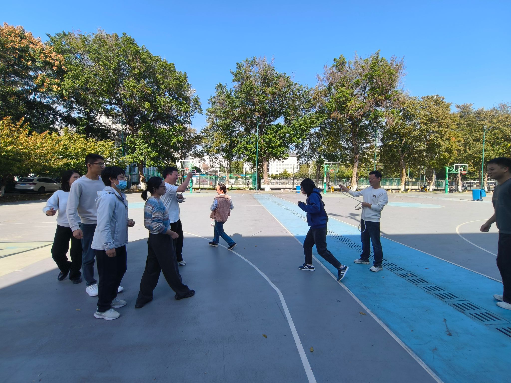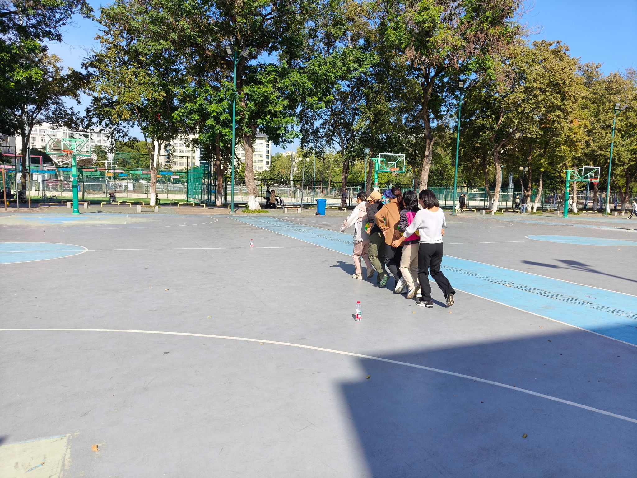 随着活动开始的信号发出,各项目现场迅速进入热烈状态。夹球跑项目中,老师们5人一队小心翼翼地用身体夹着排球快步前进,时而稳住节奏,时而加速冲刺,引得场边观众阵阵加油呐喊;钻呼啦圈环节,老师们灵活地扭动身体,一个个顺利穿过呼啦圈,展现出不输年轻人的敏捷身手;定点投篮区更是精彩不断,老师们凝神聚力,瞄准篮筐,每一个精准的进球都伴随着欢呼声与掌声;跳大绳项目则将活动氛围推向高潮,老师们默契配合,随着绳子的摆动整齐跳跃,大家齐心协力,挑战着一个又一个目标。