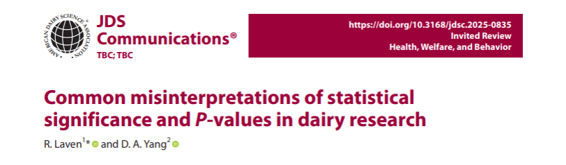 近日,应JDS Communications 主编Jessica McArt教授(康奈尔大学)邀请,必赢线路检测3003杨丹晨副教授与梅西大学教授、bwin必赢3003名誉教授Richard Laven 院士,合作撰写并发表题为 “Common misinterpretations of statistical significance and P-values in dairy research”的invited review论文。 该文直指指奶业科研领域长期存在的结构性统计误读及其带来的学术与实践危害,提出以“兼容效应范围(compatibility interval)”为核心的结果解释框架。论文为期刊编辑部制定统计报告标准提供了可执行依据,未来将影响乳业科学期刊的投稿与审稿规范,引导科研成果报告从“是否显著”走向“结果是否可信、解释是否充分”。