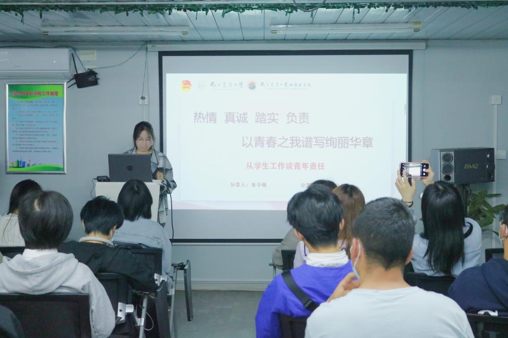 活动中,南京大学马克思主义学院青年讲师团成员尹紫琦围绕学习宣传贯彻党的二十大精神,结合青年个人成长实际进行党的理论青年化阐述。我院学生代表朱子萌,结合个人成长经历,以《从学生工作谈青年责任》为题进行了专题分享。