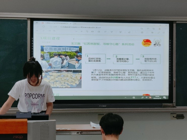 动医类2207团支部积极响应二十大号召,其特色项目为习近平“强国必先强农,农强方能国强”思想所启发,以“欢喜共迎二十大,锦绣乡村新变化”为主题,开展思想与实践并行的一系列活动,深入农村,通过对村中老人展开采访来了解旧时生活,体悟农村全面深化改革取得的卓然成就,激励新农人接续奋斗。