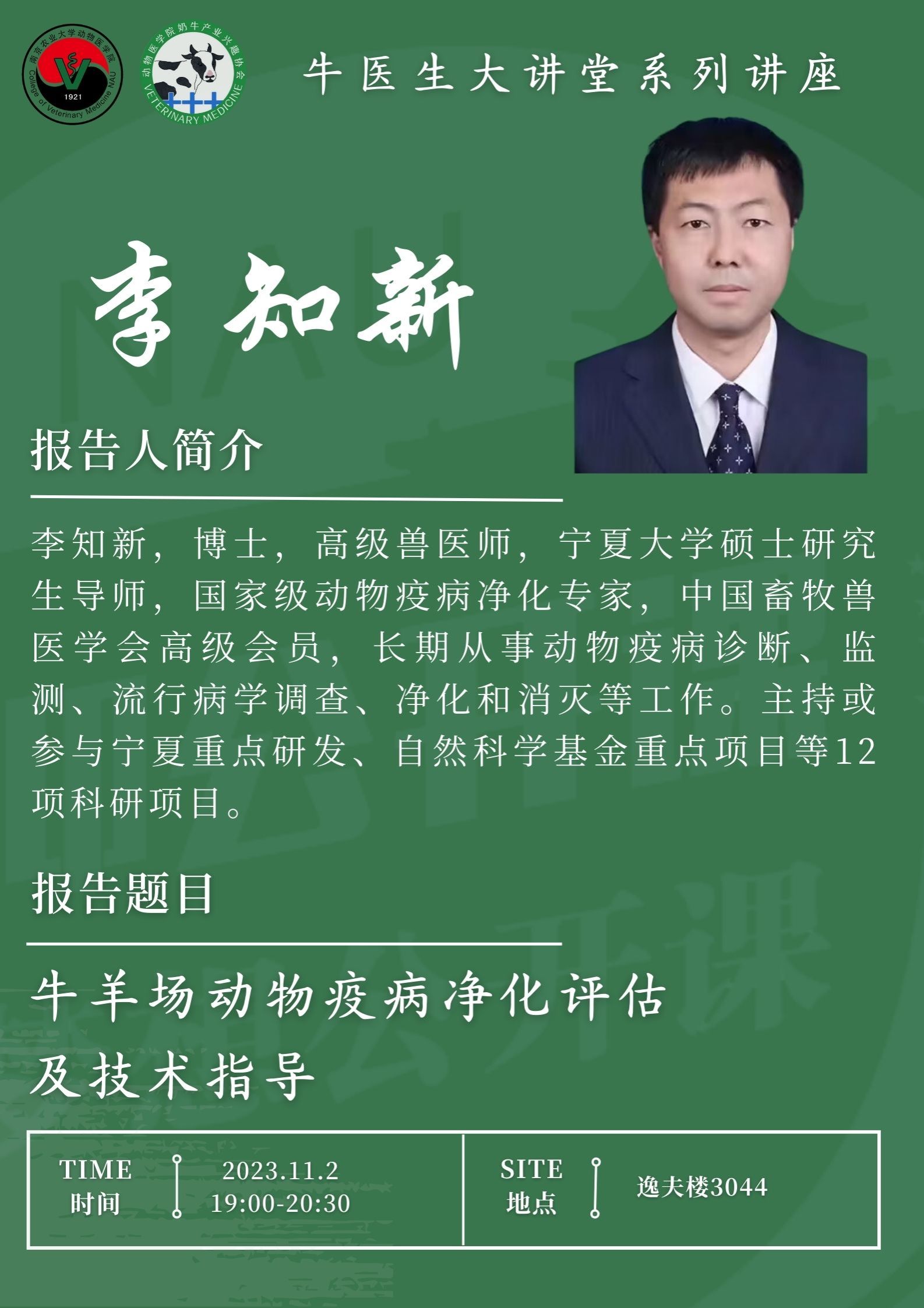 11月2日晚,必赢线路检测30032023年“牛医生大讲堂”专题培训第3期在逸夫楼3044如期举行。本次培训主题为“牛羊场动物疫病净化评估及技术指导宣讲”,由宁夏回族自治区动物疾病预防控制中心高级兽医师李知新主讲,吸引了百余名学生参加。