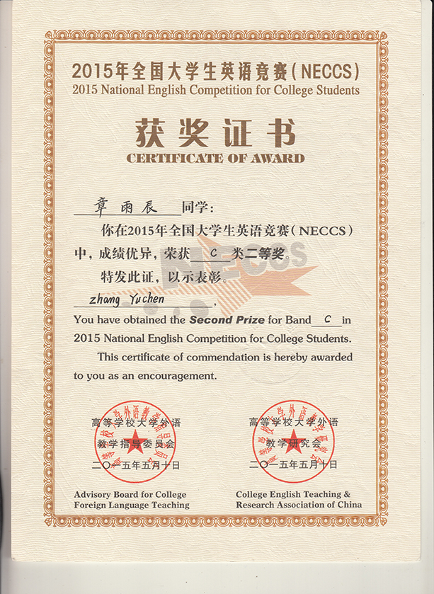 章雨辰获全国英语竞赛二等奖