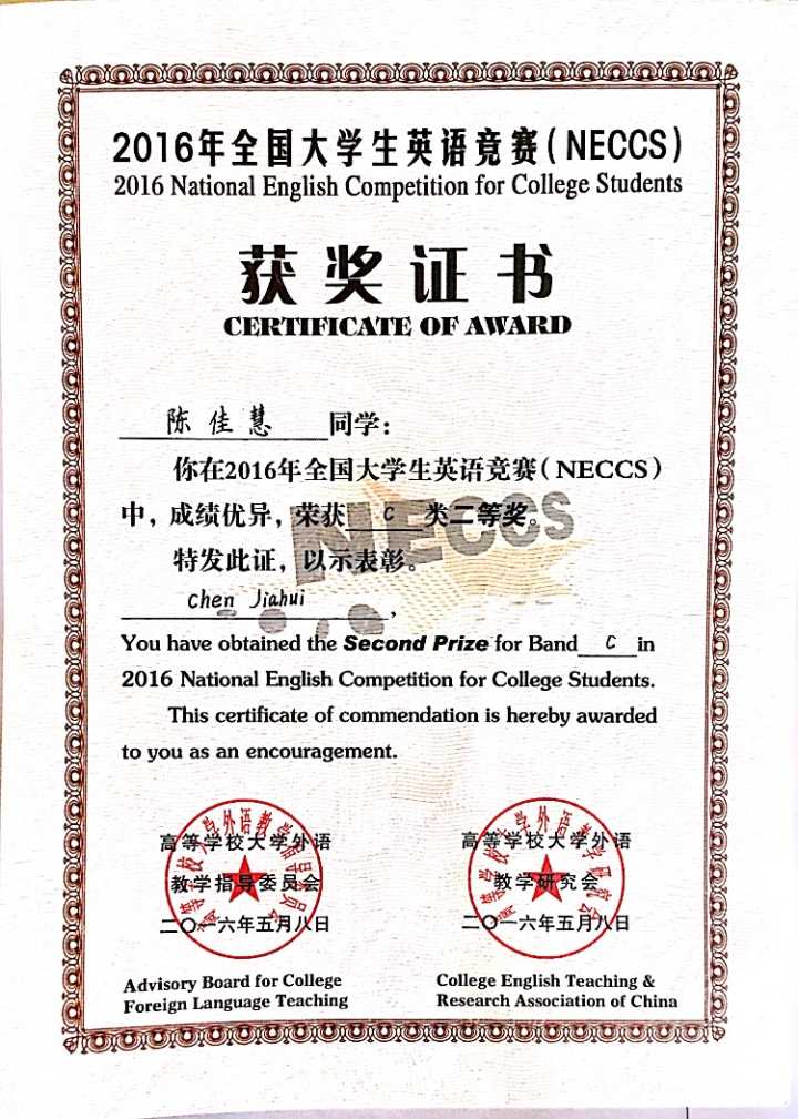 陈佳慧全国英语竞赛二等奖