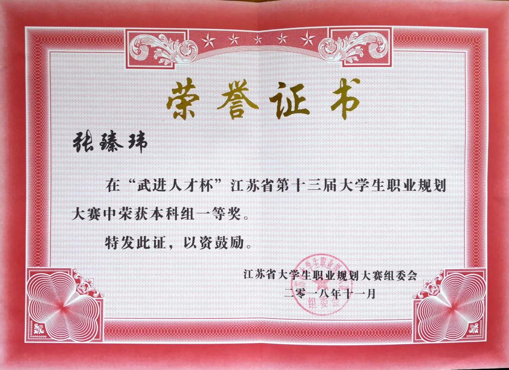 张臻玮获江苏省第十三届大学生职业规划大赛本科组一等奖